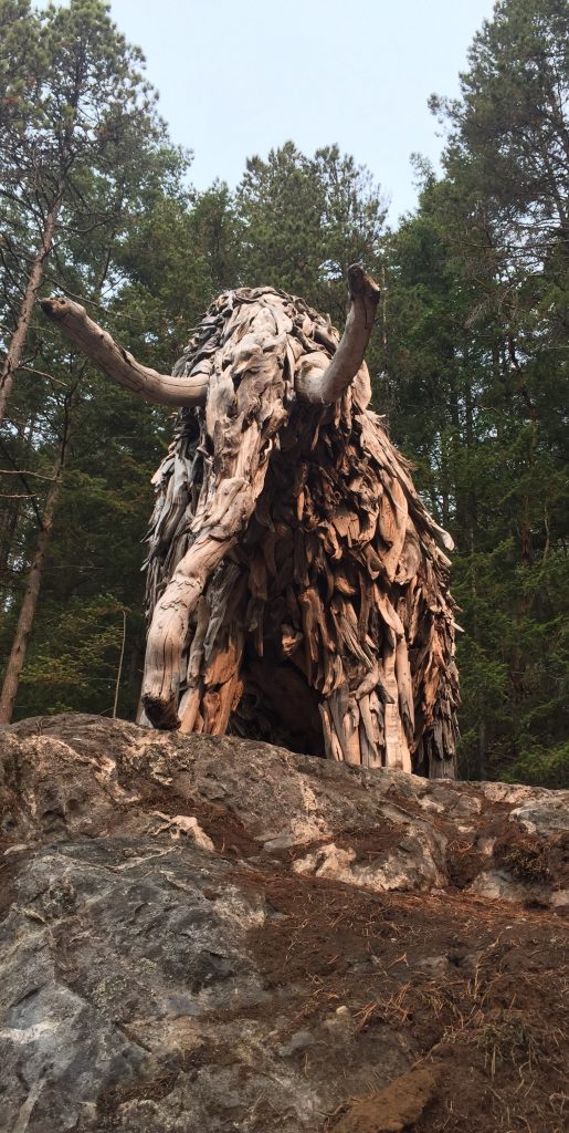 - The “Driftwood Mastodon” is an art piece by an unknown (at least to me) artist on one of our coastal islands. The location is secret and the information posted at the site asks to keep it that way.